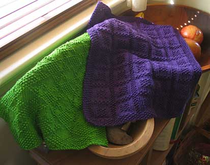 I needed hand towels for the kitchen. My mother needed a bit more on her KnitPicks order to get free shipping. So I ordered a few skeins of CotLin to help her out. I made a smaller version of the hand towel from Mason Dixon Knits. I liked it, but not enough to make two or three more just like it. So I worked out a few more patterns. Here they are.